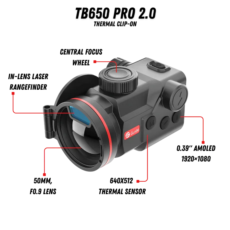 The Guide TB650 PRO LRF 2.0 is a high-performance thermal clip-on designed for hunters who want to add thermal capability to their existing daytime scope without changing their shooting setup.